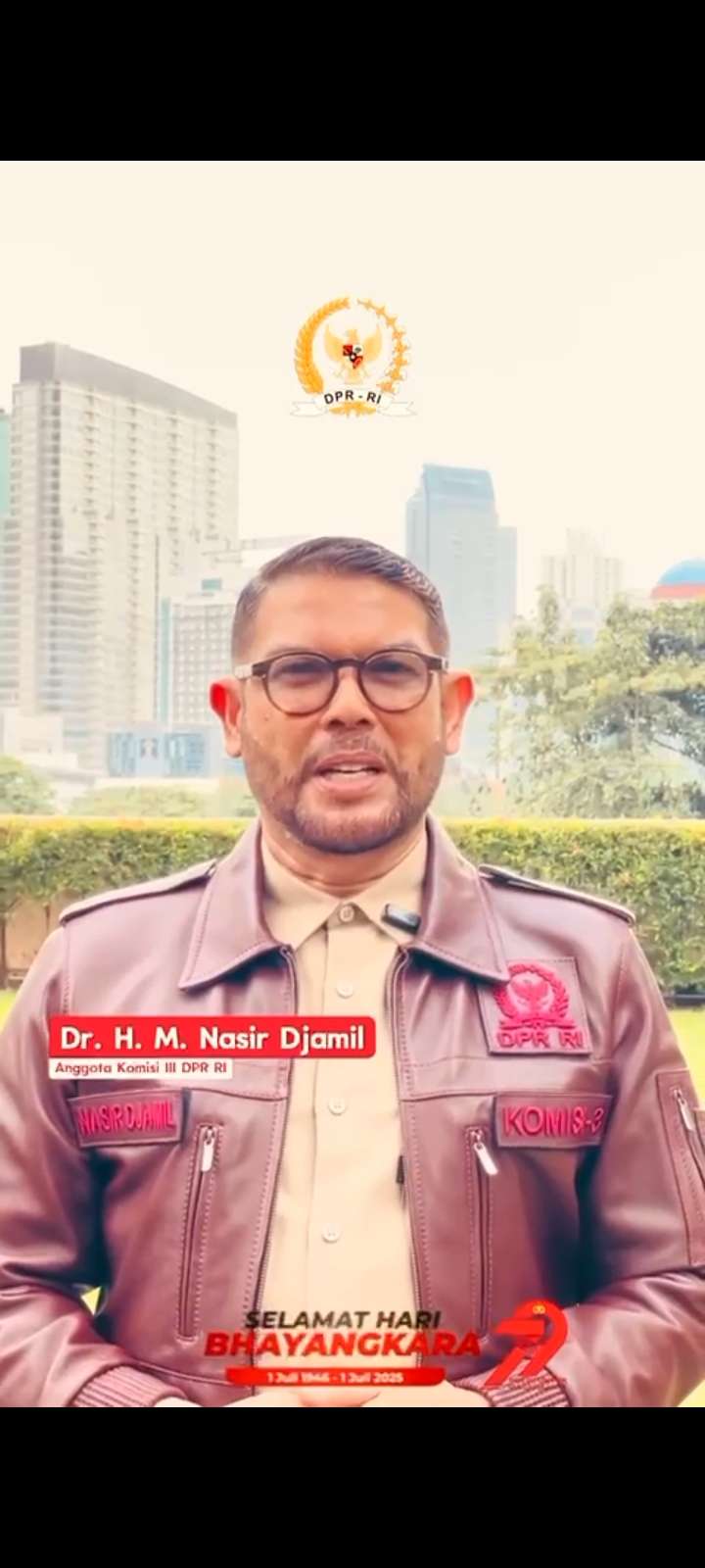 Jakarta — Dalam rangka peringatan Hari Bhayangkara ke-79, anggota Komisi III DPR RI, M. Nasir Jamil, menyampaikan ucapan selamat dan apresiasi kepada seluruh jajaran Kepolisian Republik Indonesia, baik yang masih aktif maupun para purnawirawan, dari Sabang hingga Merauke, dari Miangas hingga Pulau Roti.