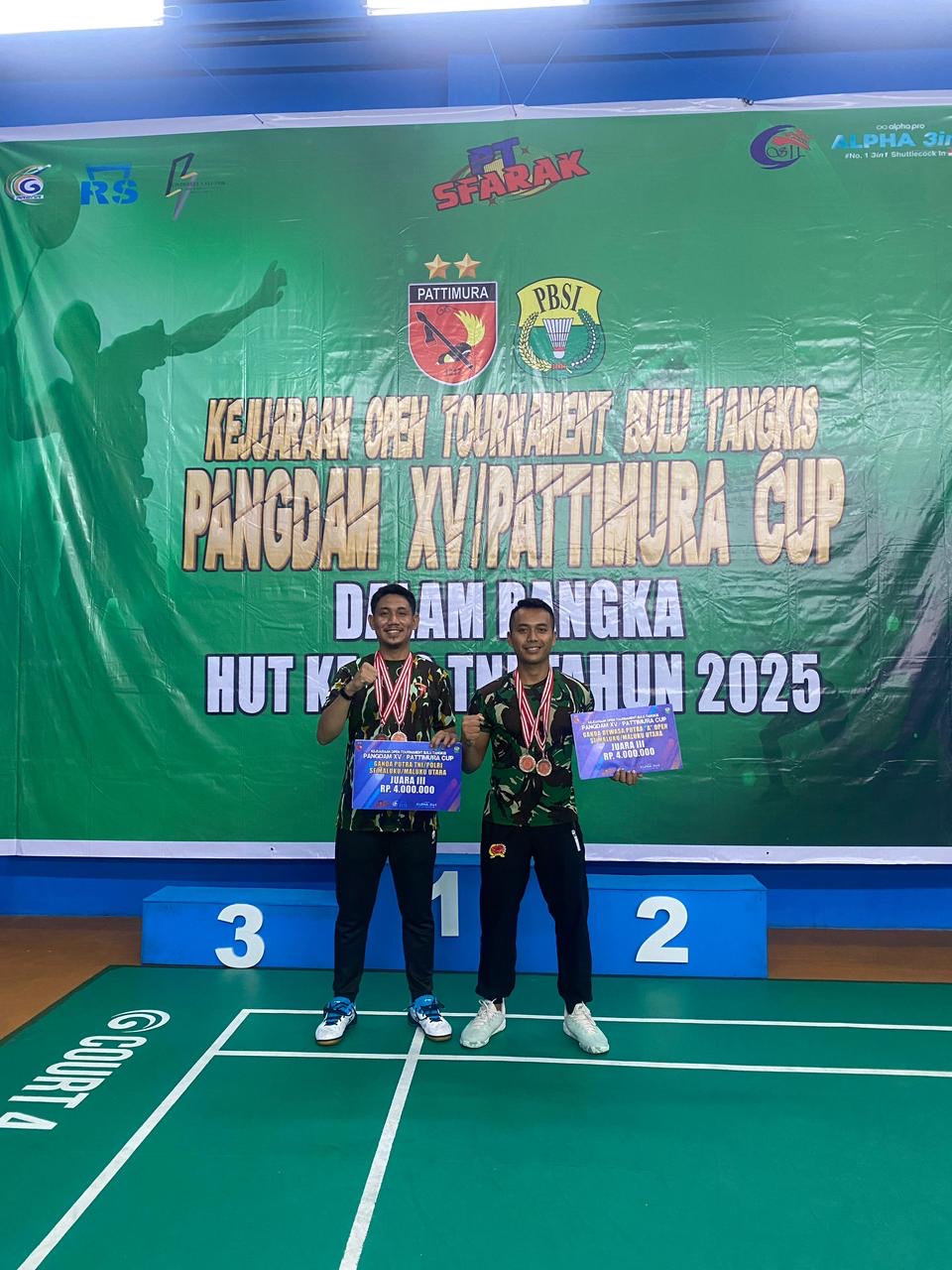 Anggota Satuan Brimob Polda Maluku Utara, Briptu Muhammad Syahputra Ahmad, berhasil meraih Juara III dalam ajang Open Tournament Bulu Tangkis Pangdam XV/Pattimura Cup yang diselenggarakan di Ambon, Provinsi Maluku, dalam rangka memperingati Hari Ulang Tahun ke-80 Tentara Nasional Indonesia (TNI) Tahun 2025, Minggu (21/9).
