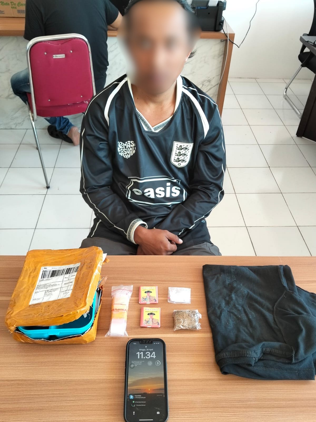 Adapun barang bukti yang berhasil diamankan antara lain satu saset kecil sabu dengan berat bruto 3,59 gram, satu saset kecil tembakau sintetis seberat 10,78 gram, satu pak plastik bening berisi 90 saset kecil, dua pak kertas rokok merek Toreador, serta satu paket pengiriman yang dililit lakban cokelat berisi tempat makan anak berwarna biru.