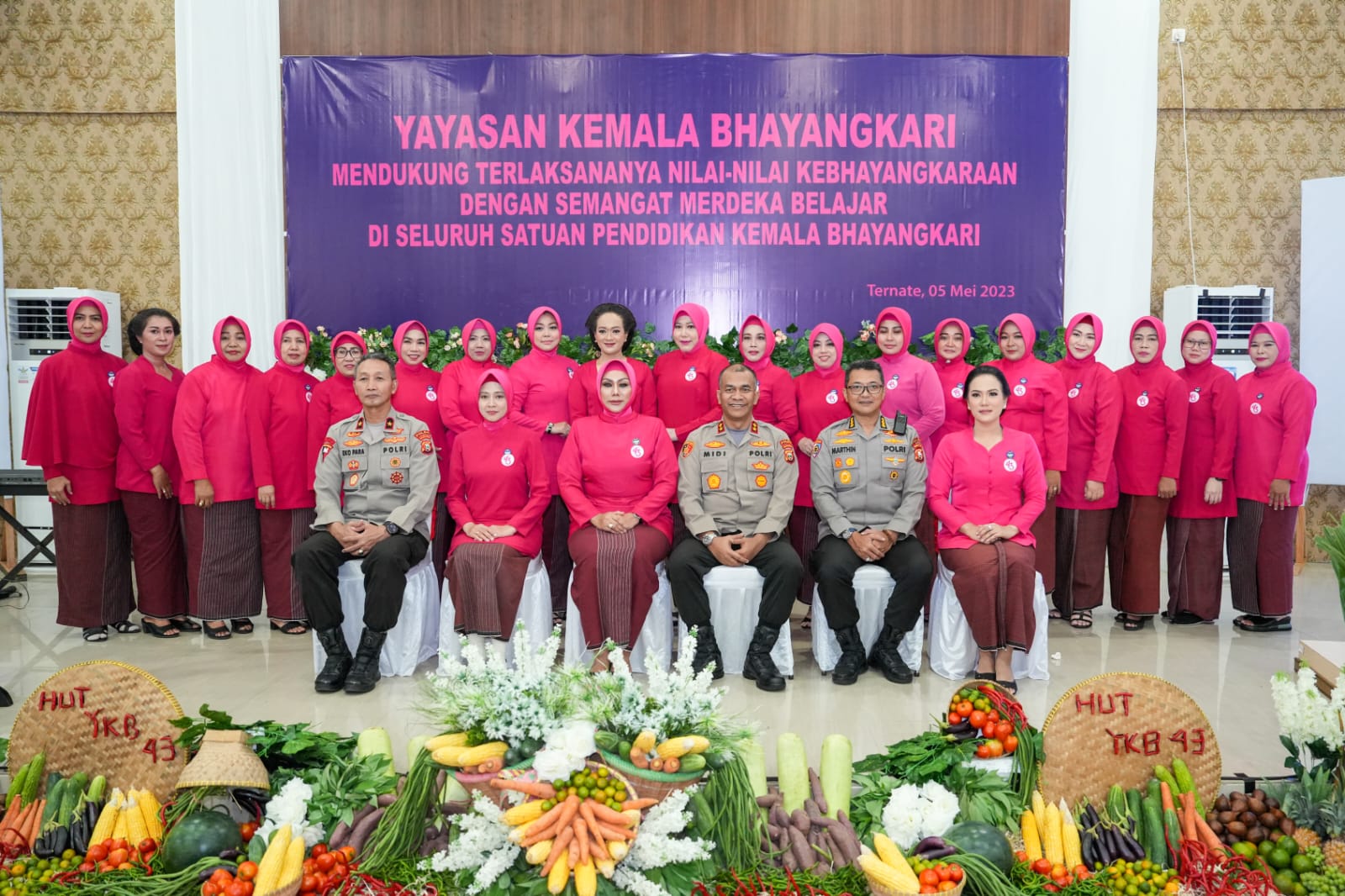 Kapolda Maluku Utara Irjen Pol Midi Siswoko, S.I.K yang di dampingi Wakapolda Brigjen Pol. Drs. Eko Para Setyo Siswanto, M.Si., dan PJU Polda Malut Serta Kapolres & Kapolresta Jajaran,mengikuti Upacara Peringatan Hari Ulang Tahun Yayasan Kemala Bhayangkari Ke-43 Tahun. Jumat (5/5/2023).