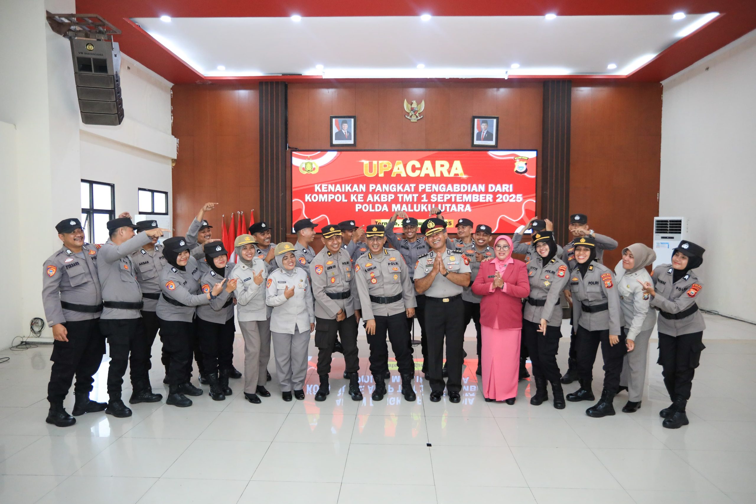 HUMAS POLDA MALUT – Kapolda Maluku Utara, Irjen Pol Drs. Waris Agono, M.Si, memimpin upacara Korps Raport kenaikan pangkat dari Komisaris Polisi (Kompol) ke Ajun Komisaris Besar Polisi (AKBP) Pengabdian. Upacara berlangsung di Aula Kieraha Polda Malut, Kamis (28/8/2025).