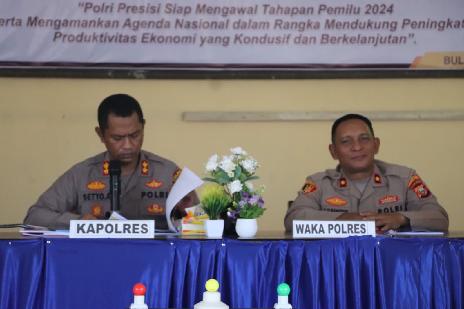 Bertempat di Aula Tribrata Polres Halmahera Timur, Kepala Kepolisian Resor Haltim AKBP Setyo Agus Hermawan S.I.K.,M.A.P memimpin langsung pelaksanaan rapat Gelar Operasi (GO) Triwulan I Polres Haltim dan Polsek Jajaran, Rabu (13/04/2023).
