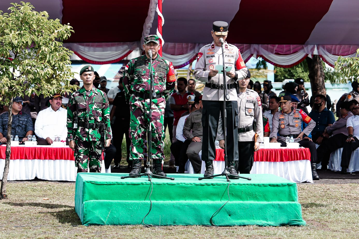 Apel yang Bertempat Lapangan Perikanan Bastiong Ternate tersebut dipimpin Wakapolda Maluku Utara Brigjen Pol. Drs. Eko Para Setyo Siswanto, M.Si. dan Danrem 152/Baabullah Brigjen TNI Inf Elkines Villando Dewangga, S.A.P.