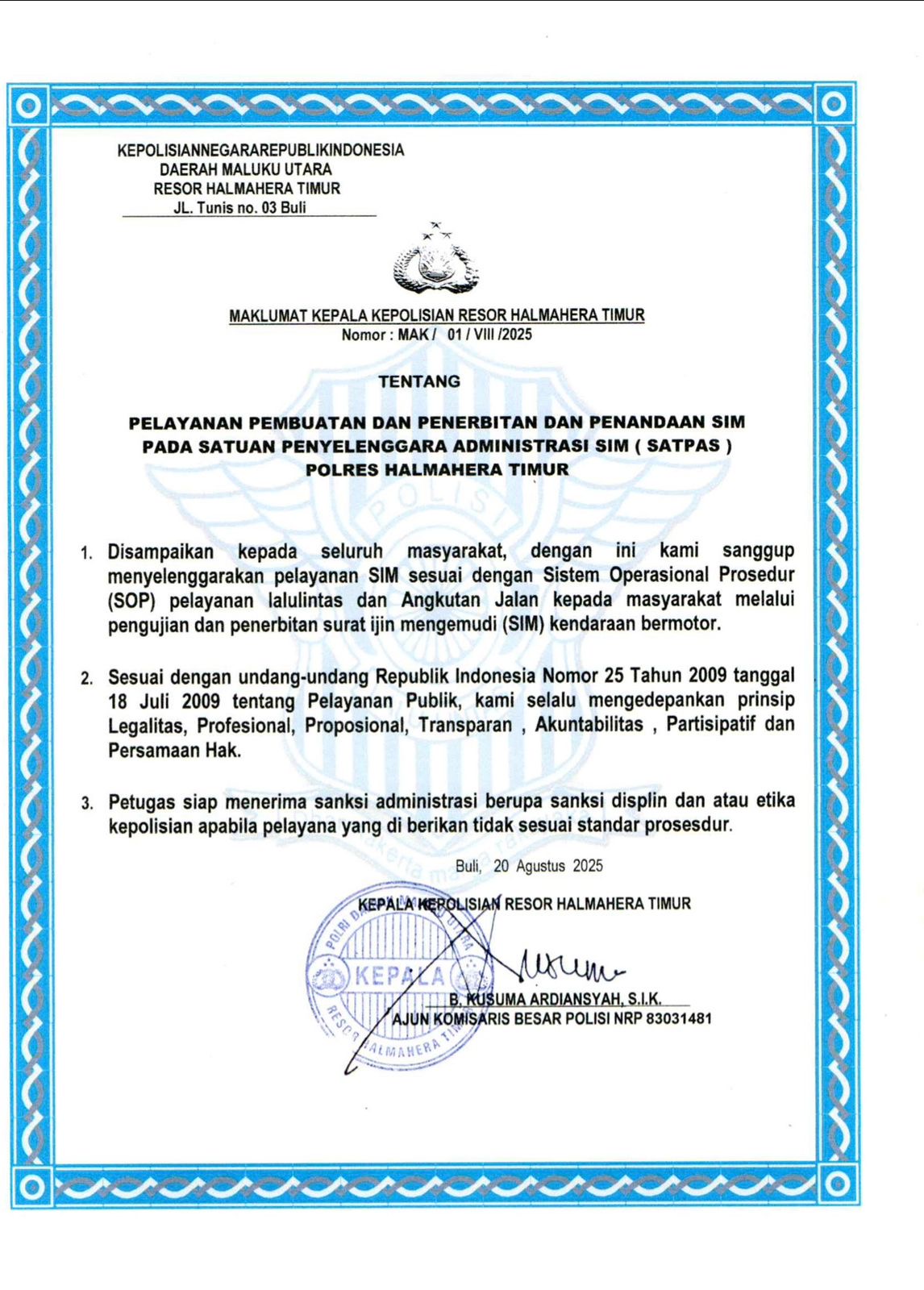 (SOP) pelayanan lalulintas dan Angkutan Jalan kepada masyarakat melalui pengujian dan penerbitan surat ijin mengemudi (SIM) kendaraan bermotor.