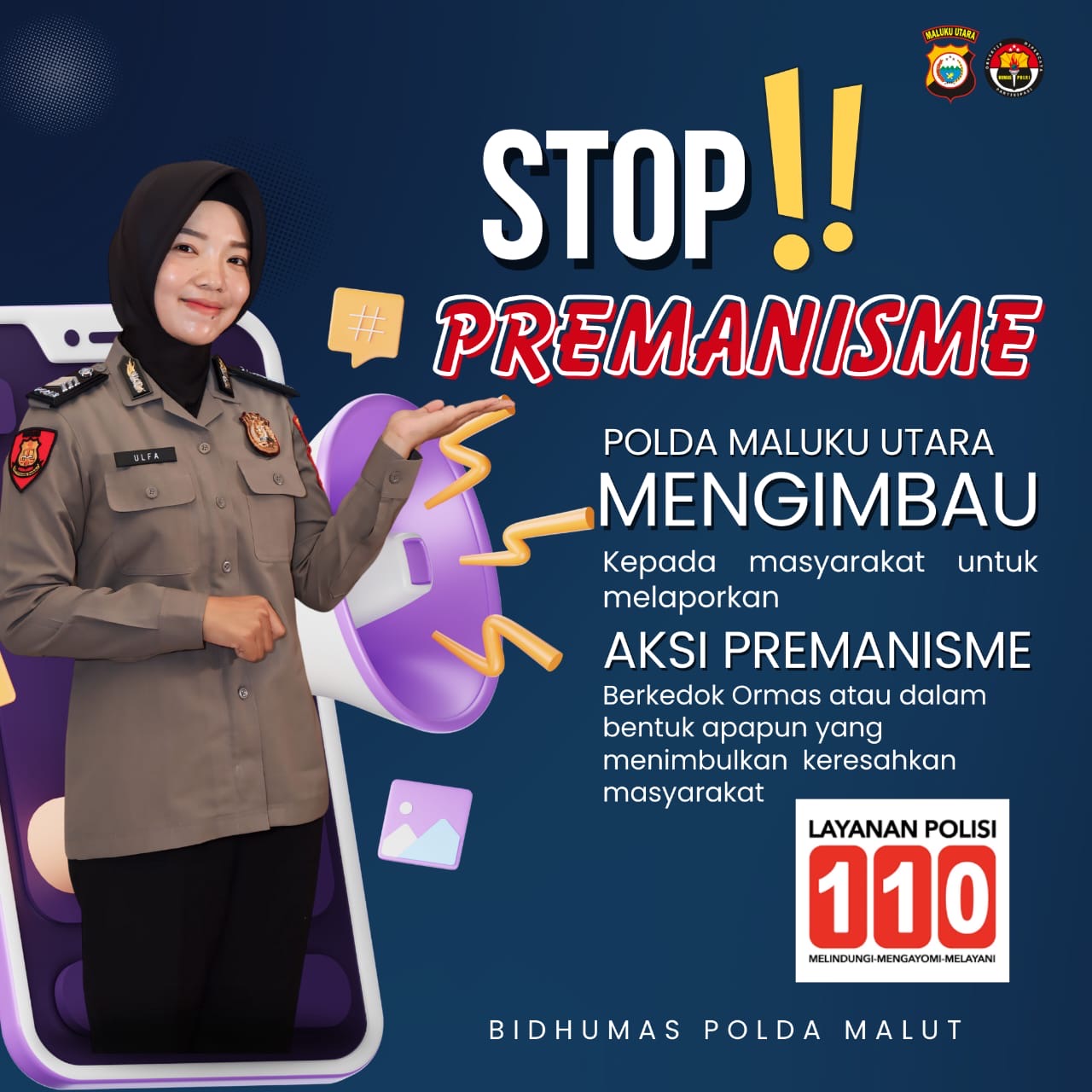 Kepolisian Daerah Maluku Utara mengimbau kepada seluruh masyarakat untuk tidak ragu melaporkan segala bentuk aksi premanisme yang berkedok organisasi kemasyarakatan (ormas) yang dapat menimbulkan keresahan di tengah masyarakat.