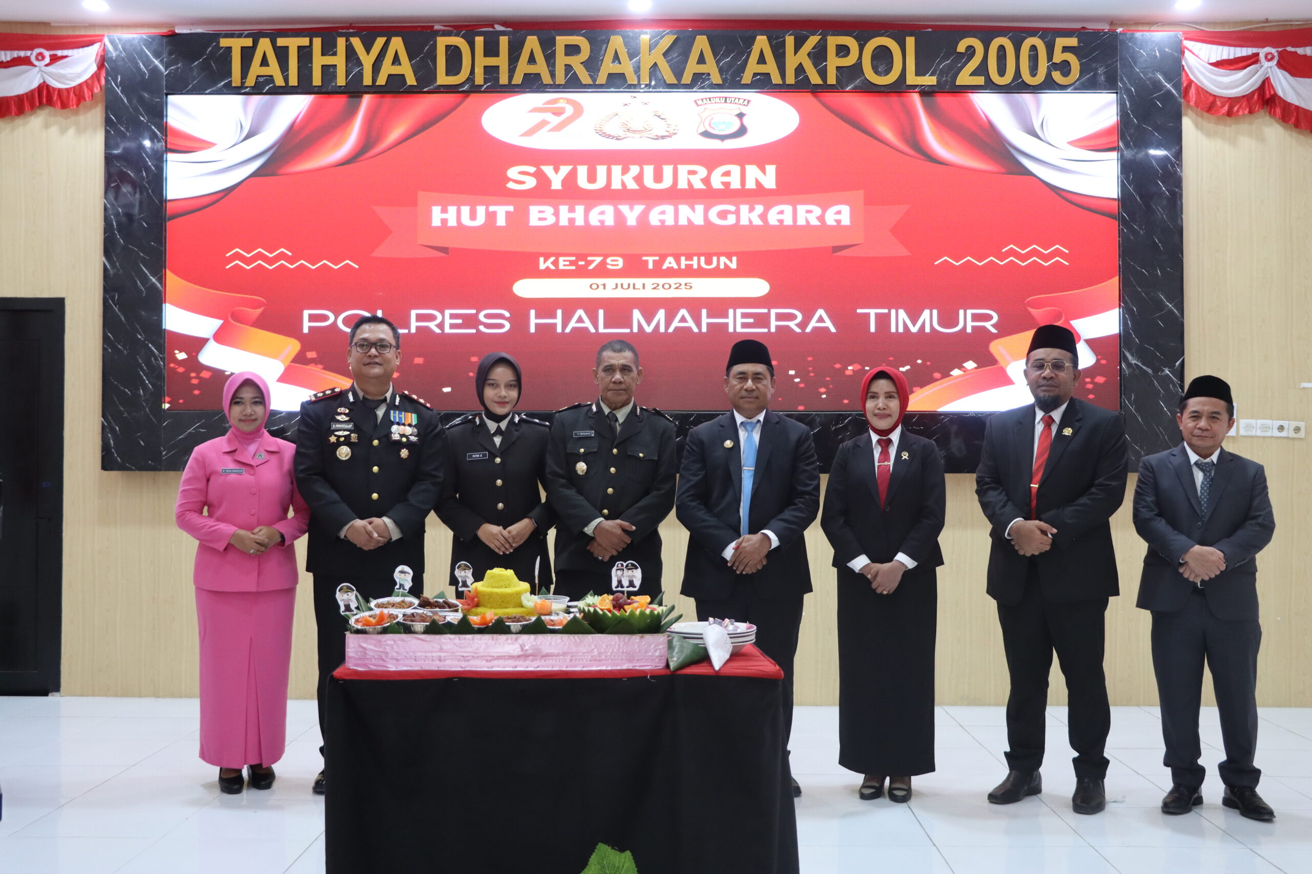 Setelah pelaksanaan upacara peringatan Hari Ulang Tahun Bhayangkara ke-79 1 juli 2025, Polres Halamhera Timur laksanakan acara Syukuran bertempat di Aula Tathya Dharaka Akpol 2005 Polres Haltim.