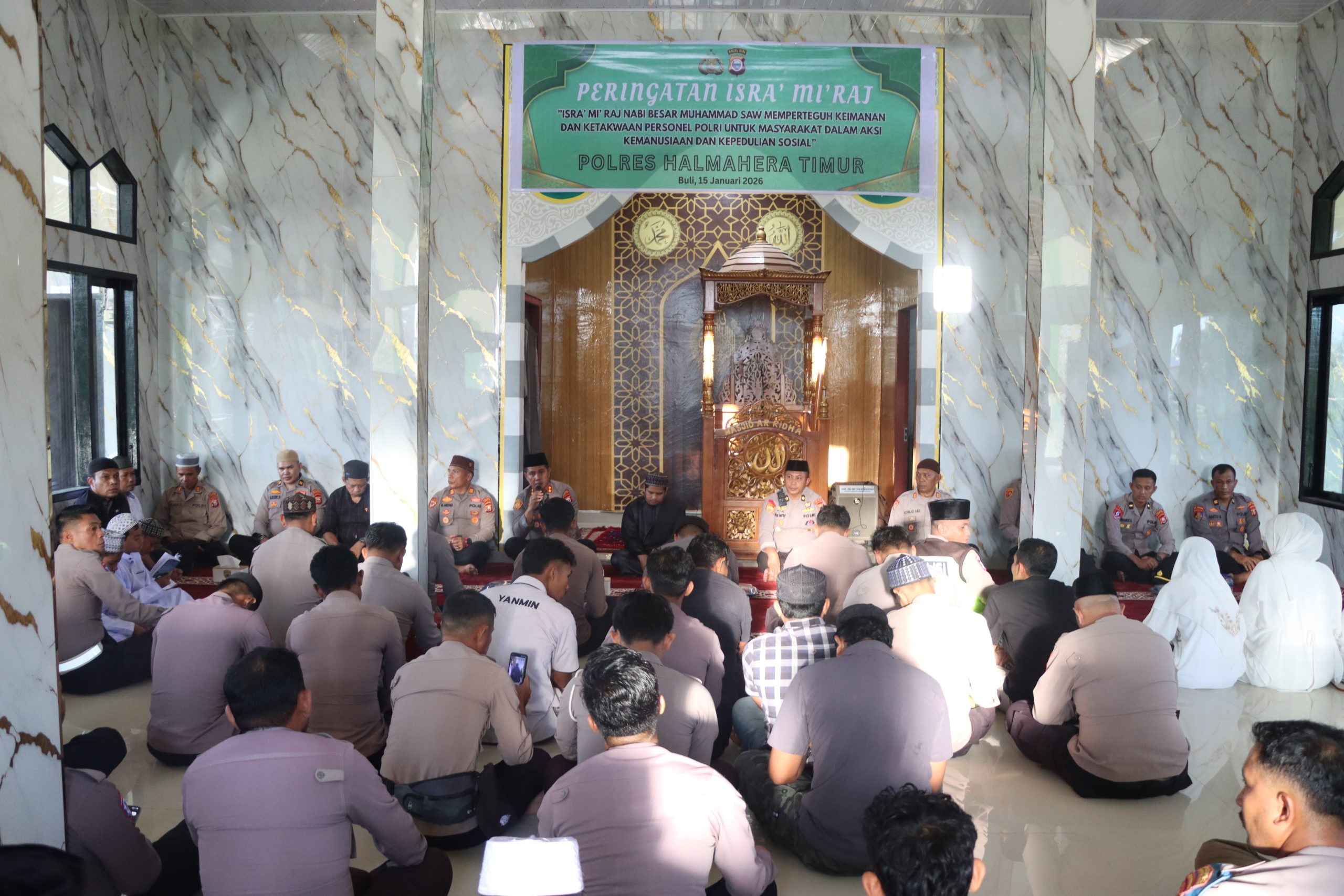 Buli – Polres Halmahera Timur melaksanakan peringatan Isra Mikraj Nabi Besar Muhammad SAW dengan tema “Isra’ Mi’raj Nabi Besar Muhammad SAW Memperteguh Keimanan dan Ketakwaan Personel Polri untuk Masyarakat dalam Aksi Kemanusiaan dan Kepedulian Sosial”, bertempat di Masji Ar Ridha Polres Halmahera Timur, Kamis, 15/1/2026.