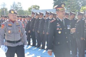Halmahera Timur_ Polres Haltim menggelar upacara memperingati hari Bhayangkara ke-77 tahun 2023, berlangsung di halaman Kantor Bupati Kabupaten Halmahera Timur Sabtu (01/07/2023),
