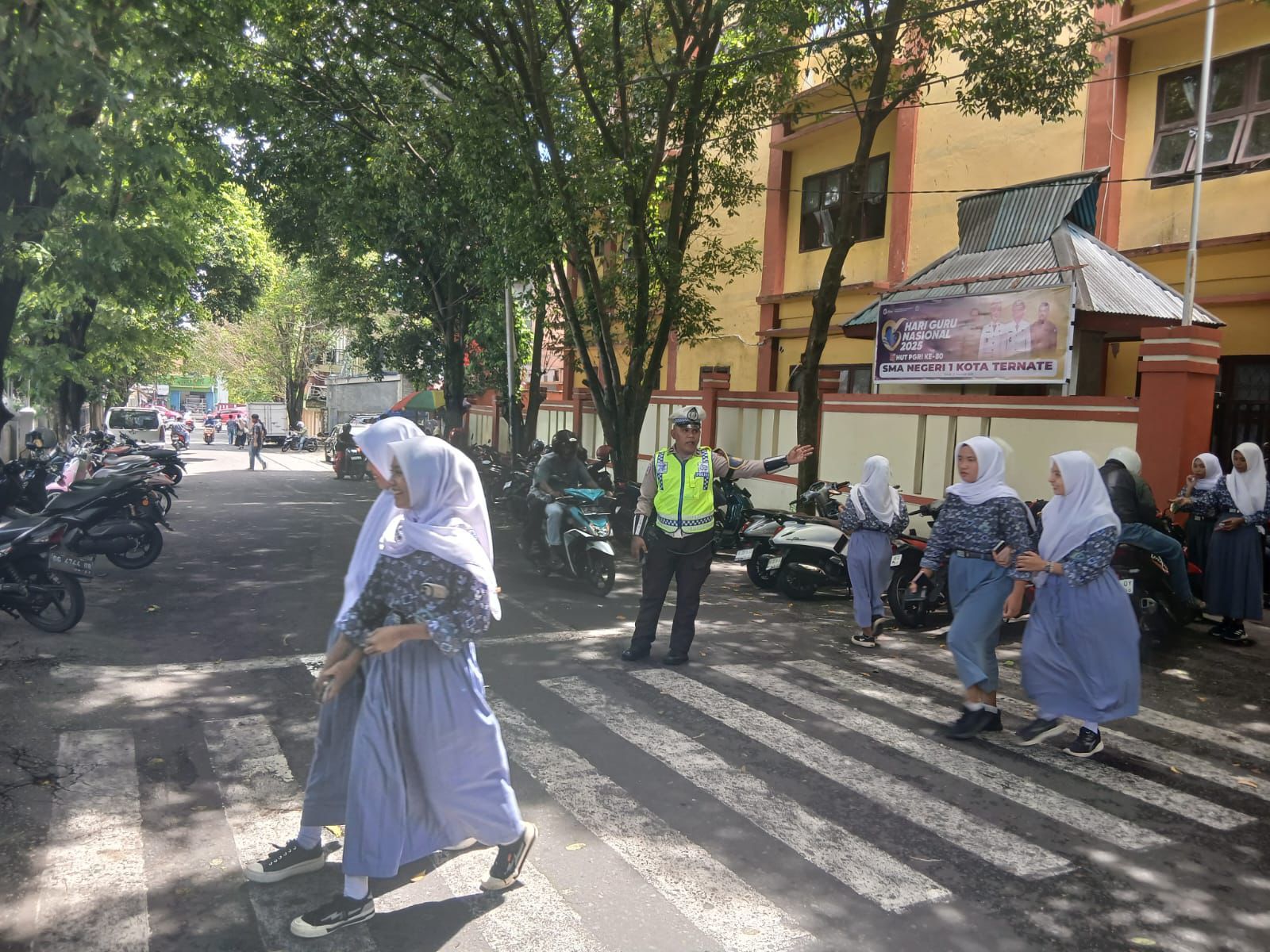 Pengamanan dan bantuan penyeberangan diberikan kepada para pelajar di depan SDN 10 Kota Ternate (Kecamatan Ternate Tengah), SDN 11 Kota Ternate (Kecamatan Ternate Selatan), serta di Jalan Siswa, Kecamatan Ternate Tengah, guna memastikan keselamatan anak-anak pada jam masuk sekolah.